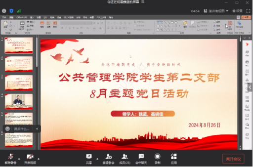 当前位置: 首页 >> 党建双创 >> 主题党日活动 >> 正文 公共管理学院学生第二党支部召开2025年8月主题党日活动 时间:2025年08月27日 15:17 作者: 蒋杰 2025年8月26日,公共管理学院学生第二党支部通过企业微信平台召开8月主题党日活动。会议由邓丽同志主持,支部全体党员线上参会。 会议上,魏蓝、聂晓佳两位同志领学了《习近平总书记在中央财经委员会第六次会议上的重要讲话精神》、《习近平总书记在中央城市工作会议上的重要讲话精神》、《习近平总书记在中共中央政治局会议上的重要讲话精神》以及习近平总书记致全国青联十四届全委会和全国学联二十八大的贺信等重要内容。随后,江雨、焦焱琦、全璐娜、蒋钰桥四位同志结合公共管理专业背景,立足人民安全、生态文明建设等多个维度,就如何将习近平总书记重要讲话精神融入实践、指导专业学习与研究进行了讲述。接下来,在分享交流的环节,高红英同志联系自身假期实际,分享了自己如何将理论学习的成果转化为公务员考试备考中的具体思路与方法,体现了学用结合的积极态度。同时,与会党员同志们也踊跃发言,分享了学习心得与感悟。 最后,邓丽同志对本次集体学习进行总结,同时,鼓励支部全体党员继续深化对党的创新理论的理解与把握,不断提升政治素养和业务能力。 上一条:党委常委、副校长田双全调研指导公共管理学院全面从严治党工作 下一条:公共管理学院学生第一党支部8月主题党日活动 【关闭】
