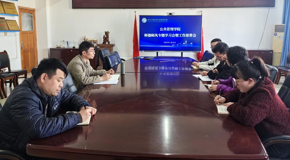 当前位置: 首页 >> 学院新闻 >> 正文 立德树人守初心 铸魂育人担使命 公共管理学院各系部召开师德师风专题教育学习会 时间:2025年12月03日 16:15 作者: 王长征 为落实新时代教师队伍建设要求,引导全院教职工坚定理想信念、涵养高尚师德、提升育人能力,公共管理学院于近日召开师德师风专题教育学习会。 11月26日,学院教学副院长、各系部主任以及教务办工作人员召开师德师风专题学习会暨工作布置会。会议开始,王长征副院长领学了《新时代高校教师职业行为十项准则》和《重庆工商大学教职工职业行为负面清单(试行)》等重要文件,强调了教师职业道德的底线要求和红线意识。随后,对学院师德师风专题教育学习工作进行布置,要求各系部高度重视对系部教师师德师风的要求,这既是对教师的警示提醒和严管厚爱,也是深化学院教学育人的关键之举。 11月27日,我院公共管理系、劳动与社会保障系、城乡规划系、土地资源管理系四个系部分别召开师德师风专题教育学习会。各系部主任分别领学相关政策文件要求,理解政策文件的核心要义和行为规范,并且结合系部自身专业特征和实际情况,进行反思和讨论,严格自觉对照准则要求,规范从教行为,提升师德素养。 师德师风建设永远在路上。学院及系部召开专题学习会,使得全体教师进一步统一了思想,提高了认识,明确了方向。在未来,学院将以此次学习为新的起点,内化于心、外化于行,把师德规范融入教育教学全过程,构建具有公管特色的师德师风建设长效机制,营造风清气正、崇德向善的教书育人环境。 上一条:党建引领聚合力,校地合作谋发展公共管理学院党委与两江新区翠云街道党工委开展结对共建活动 下一条:校企协同赋能设计启蒙 手绘课程点亮规划新生专业之路 【关闭】