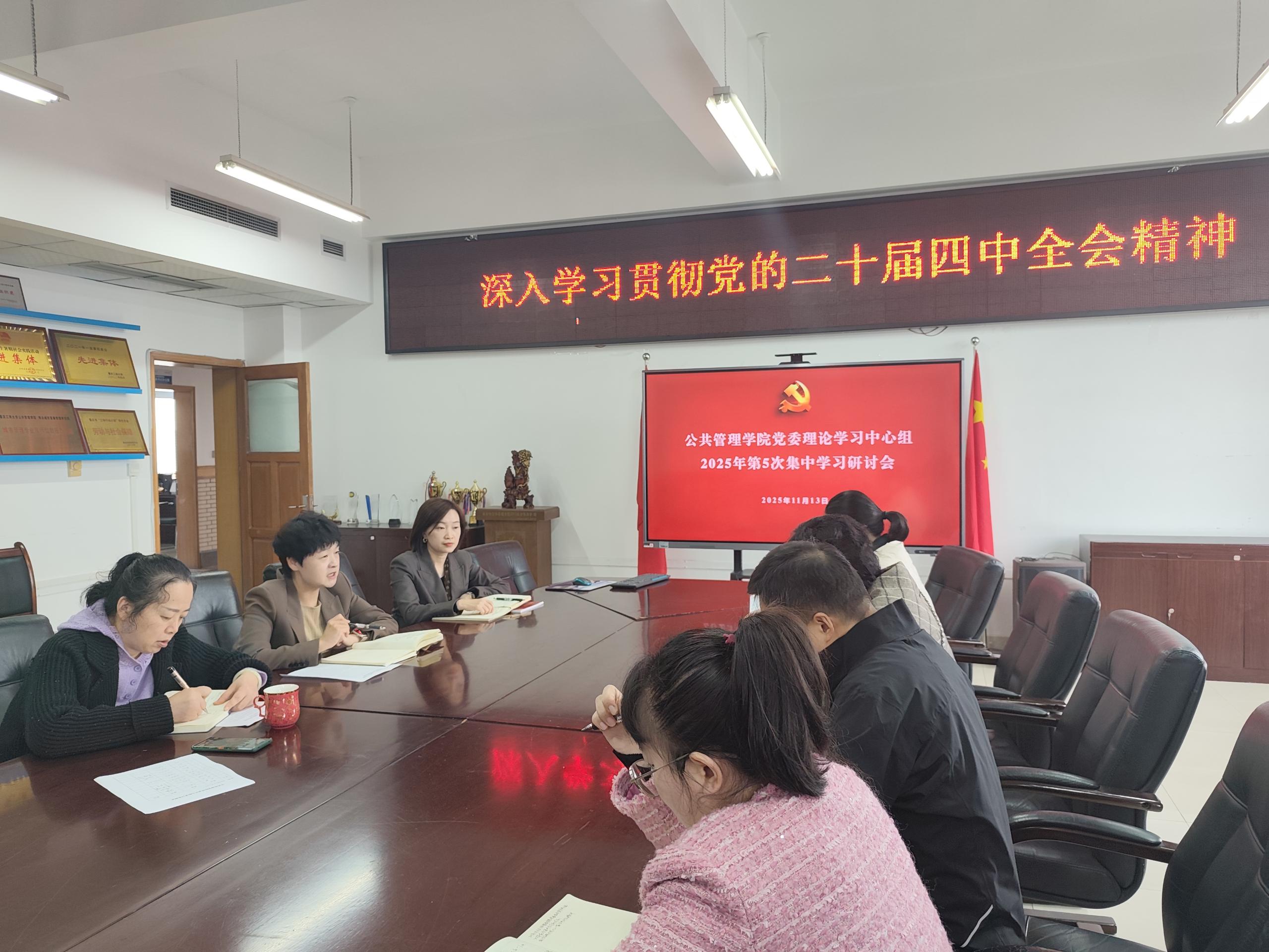 当前位置: 首页 >> 党建双创 >> 正文 学院党委理论学习中心组集中学习贯彻党的二十届四中全会精神 时间:2025年11月17日 10:33 作者: 11月13日下午,学院党委在81004会议室召开2025年第5次党委理论学习中心组学习会,深入学习贯彻党的二十届四中全会精神,深刻领悟“两个确立”的决定性意义,增强“四个意识”、坚定“四个自信”、做到“两个维护”,切实把思想和行动统一到党中央决策部署上来,奋力推动学院“十五五”改革发展目标任务落实落地,为学校特色高水平大学建设和中国式现代化建设贡献力量。会议由学院党委书记陆嘉主持,党委委员和各支部书记参加了本次学习会。 学习会采取会前自学、集中学习和交流讨论相结合的方式进行。在交流讨论环节,学院党委副书记、院长李孜围绕《中国共产党第二十届中央委员会第四次全体会议公报》等学习内容做了题为《“十五五”时期卫生健康事业规划应重点关注哪些方面》的交流发言;党委副书记、纪委书记谢书楠做了题为《以高质量学生工作服务高校治理现代化》的交流发言。 陆嘉作总结讲话。她指出,本次中心组学习深入系统,成效显著。我们共同深入学习了党的二十届四中全会精神,交流热烈,认识深刻。全会为我们擘画了“十五五”时期的宏伟蓝图,意义重大,影响深远。她强调,一要提升政治站位,将学习贯彻全会精神作为学院当前和今后一段时期的重大政治任务,确保学深悟透、入脑入心。二要分层次开展深入学习。要利用教职工政治理论学习、“三会一课”、主题党团日、青马工程培训等方式组织师生开展专题学习。三是要做好宣传报道。要利用院网设立专栏,广泛宣传学院学习贯彻全会精神的典型做法和师生学习心得。四要科学谋划发展,对标对表国家战略部署与学校“十五五”时期的各项目标任务,紧密结合学院实际,高质量编制好学院的“十五五”规划,明确目标与路径。五要持续加强党的领导,将党的领导贯穿于学院治理全过程,落实全面从严治党主体责任,营造风清气正的干事创业氛围,为规划的各项重点任务落地落实提供坚强政治保证,始终把党建“第一责任”融入发展“第一要务”,持续推进“一融双高”,为学校建设特色高水平大学,为中国式现代化建设贡献应有力量。 下一条:【学习资料3】中共中央关于制定国民经济和社会发展第十五个五年规划的建议 【关闭】