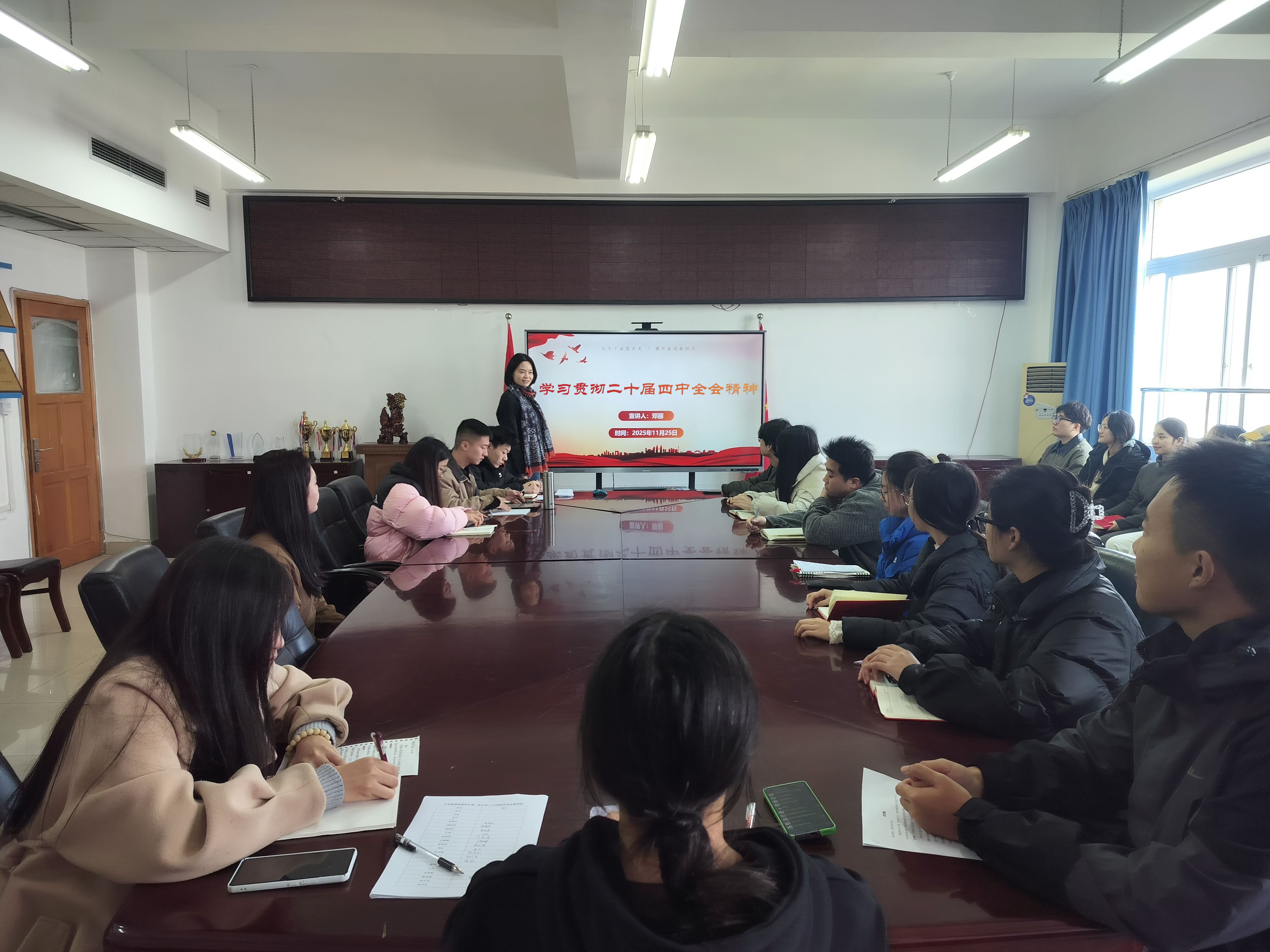 当前位置: 首页 >> 党建双创 >> 主题教育 >> 正文 【党课开讲啦】凝聚青年力量 践行使命担当 ——公共管理学院学生第二党支部举办二十届四中全会精神专题学习会 时间:2025年11月25日 15:30 作者: 蒋杰 为深入学习贯彻党的二十届四中全会精神,引领青年党员建功新时代,2025年11月25日,重庆工商大学公共管理学院学生第二党支部举办专题学习会。本次学习会由支部宣传委员、学院分团委书记邓丽担任主讲,支部全体学生党员参与学习。 邓丽立足公共管理专业特色,从青年学生的视角出发,对全会精神进行了生动解读。她重点分析了“国家治理现代化与青年使命”的内在联系,指出新时代学生党员要主动将个人成长融入国家发展大局,在专业学习与社会实践中提升综合能力,争做懂治理、善服务、勇担当的先锋力量。 结合共青团工作和学生党员培养实际,邓丽提出三点期望:一要筑牢信仰根基,做理论学习的先行者,持续深化对全会精神的理解把握;二要练就过硬本领,做知行合一的实干家,努力成为推进国家治理现代化的后备军;三要勇担时代重任,做服务奉献的排头兵,在志愿服务、基层治理等实践中展现青年党员的担当。 学习会现场气氛活跃,互动热烈。与会党员纷纷表示,此次宣讲内容贴近青年实际,语言生动鲜活,既有思想引领,又有实践指导。通过深入学习,进一步明确了自身肩负的责任,将牢记嘱托、砥砺奋进,把学习成果转化为推动学业进步和参与社会服务的实际行动,为实现中华民族伟大复兴贡献青春智慧与力量。 上一条:公共管理学院党委书记陆嘉宣讲党的二十届四中全会精神 下一条:学院党委理论学习中心组集中学习贯彻党的二十届四中全会精神 【关闭】