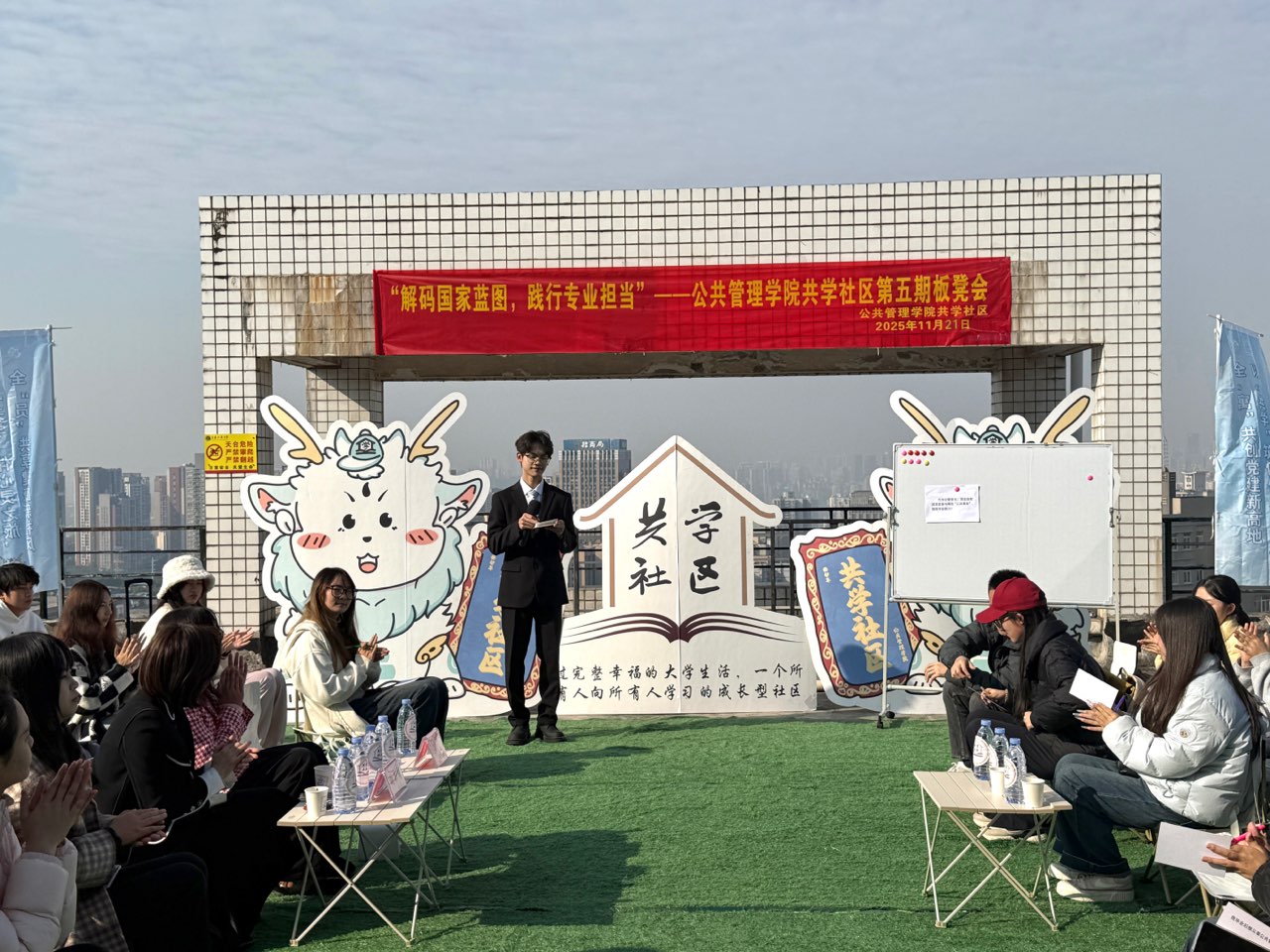 当前位置: 首页 >> 学团工作 >> 共学社区 >> 正文 “解码国家蓝图,践行专业担当”——公共管理学院共学社区举办第五期板凳会 时间:2025年11月24日 16:07 作者: 梅艺 为深入学习贯彻“十五五”规划精神,引导青年学子从专业视角读懂国家发展蓝图,将专业使命与时代担当紧密结合,近日,公共管理学院在“共学社区”举办以“解码国家蓝图,践行专业担当”为主题的第五期板凳会。活动邀请马克思主义学院思政课教师胡義博士做客共学社区,与学生支部书记、辅导员、青年学子代表围坐一堂,通过“蓝图趣解+圆桌思辨+问答互动+行动打卡”的多元形式,共同探讨公管青年如何将专业所学融入国家公共事务,在实践中践行青年担当。公共管理学院党委副书记谢书楠出席活动。 本次活动以“蓝图趣解·公管视角”为开端。胡義围绕“十五五”规划中的基层治理现代化、公共服务提质和数字政务升级,结合社区智能门禁、乡镇养老服务站、大学生社区议事等案例,阐释专业使命,助力将国家蓝图转化为实践方向。在“圆桌思辨”和“问答互动”环节,师生围绕公管学生如何参与校园公共事务、助力公共服务提升及青年担当核心展开深入交流,结合校园和社区实践,明确为民服务初心、务实调研和行动力的重要性。学生们分享智能政务、绿色治理等实践规划,制定“补短计划”,进一步明确个人成长与国家需求的结合。 最后,学生在“公管专属行动卡”上许下校园实践、职业规划和榜样学习的承诺,贴于“担当墙”,将专业担当转化为具体行动。 谢书楠在总结中指出,国家蓝图不是遥不可及的文字,而是藏在我们每天接触的社区服务、政务办理里,做好这些事,正是公管人的专业使命。她鼓励同学们将今天的收获转化为行动,在校园里做“公共事务的参与者”,在社区里做“公共服务的助力者”,成长为懂政策、会实践、有担当的公管青年。学院将继续以“板凳会”为载体,把“共学社区”打造成同学们读懂国家政策、链接专业实践、践行青年担当的“成长场域”,让公管青年在“小场景”里涵养“大担当”。 上一条:“银幕鉴往昔,思辨启新程”——公共管理学院共学社区党员服务站举办观影研讨活动 下一条:AI赋能:智教•智学•智研——公共管理学院举办第五期“书记下午茶”暨“卓越导师制”启动会 【关闭】